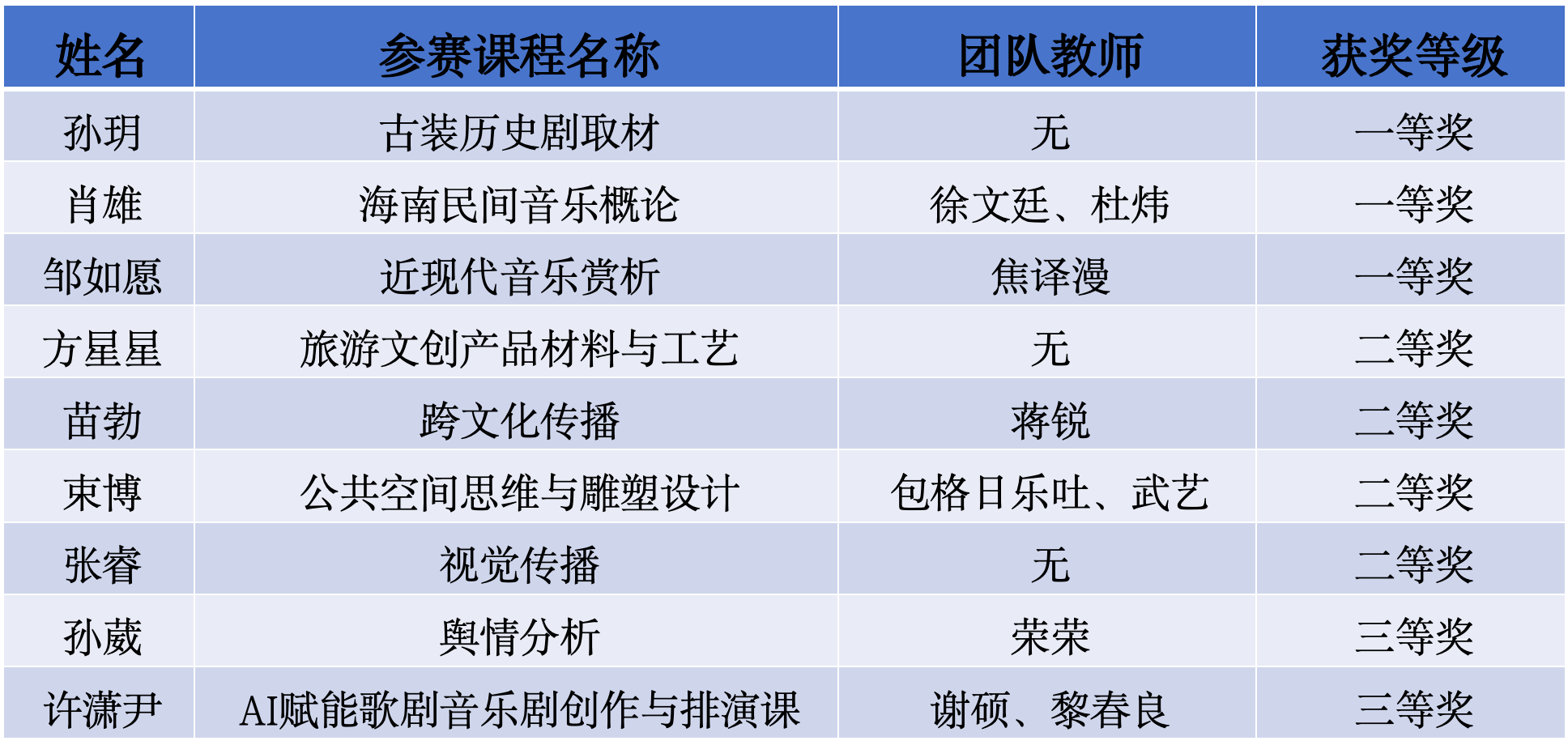 教师结合自身教学实践,围绕“AI赋能课程建设”,将AI图像、视频生成、剪辑、三维建模、数字人、大数据等技术与中国优秀传统文化、音乐、设计、大众传播等议题结合,积极参赛,斩获佳绩。孙玥、肖雄、邹如愿荣获一等奖,方星星、苗勃、束博、张睿荣获二等奖,孙葳、许潇尹荣获三等奖。