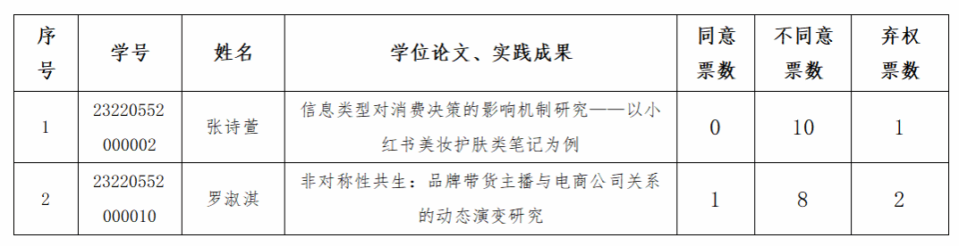 学位申请人张诗萱(2023级新闻与传播专业,培养层次为硕士,导师为秦艳,学位论文题目为《信息类型对消费决策的影响机制研究——以小红书美妆护肤类笔记为例》)、罗淑淇(2023级新闻与传播专业,培养层次为硕士,导师为何晶娇,学位论文题目为《非对称性共生:品牌带货主播与电商公司关系的动态演变研究》),对学位论文评审结果存在异议,提出学术复核申请。学院学术委员会以及学位审议委员会对申请材料共同审核、并通过投票方式,形成了“经审核不受理”的处理意见。投票结果如下: