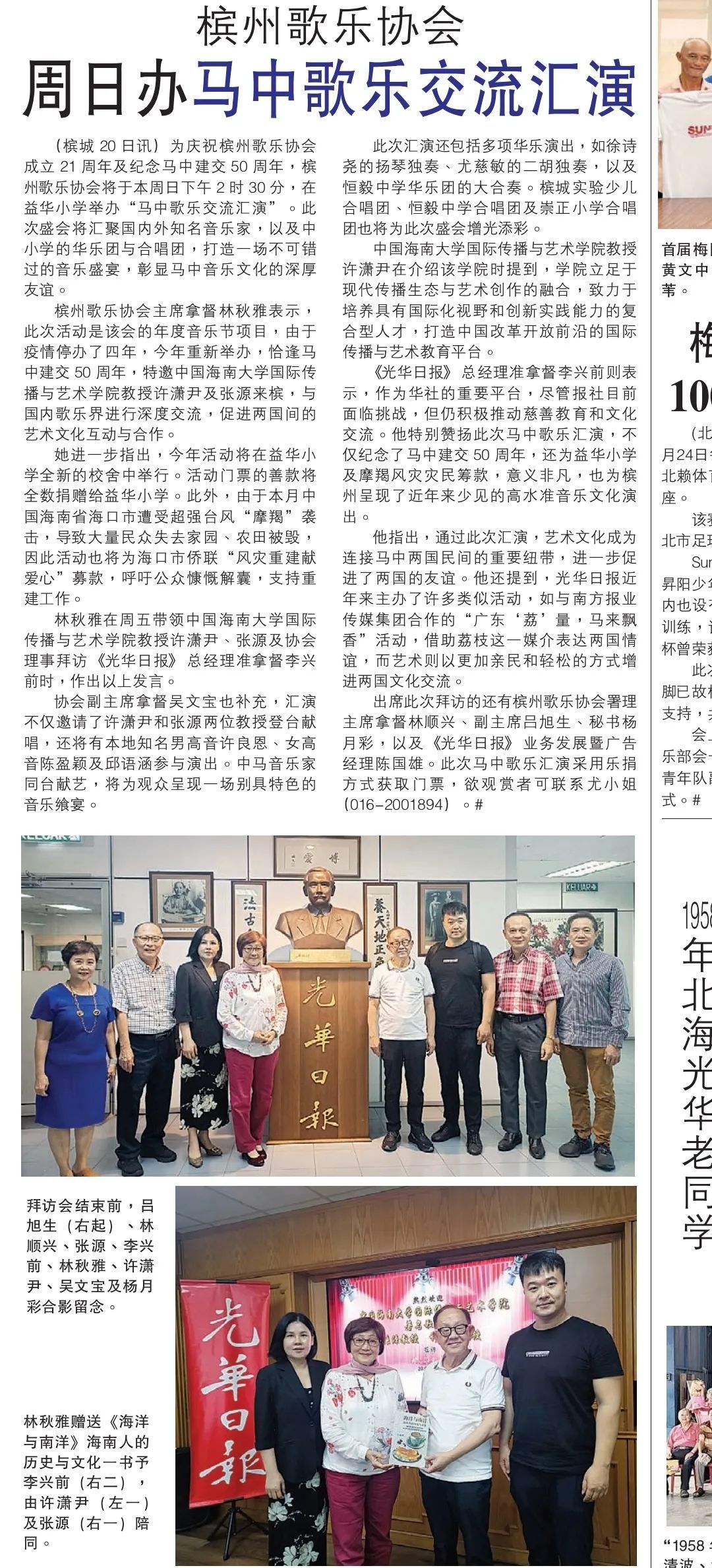 为庆祝马来西亚槟州歌乐协会成立21周年及纪念中马建交50周年,9月22日马来西亚槟州歌乐协会在马来西亚益华小学举办“中马歌乐交流汇演”。此次盛会汇聚了马来西亚国内外知名音乐家以及中小学的华乐团与合唱团,打造一场不可错过的音乐盛宴,彰显中马音乐文化的深厚友谊。