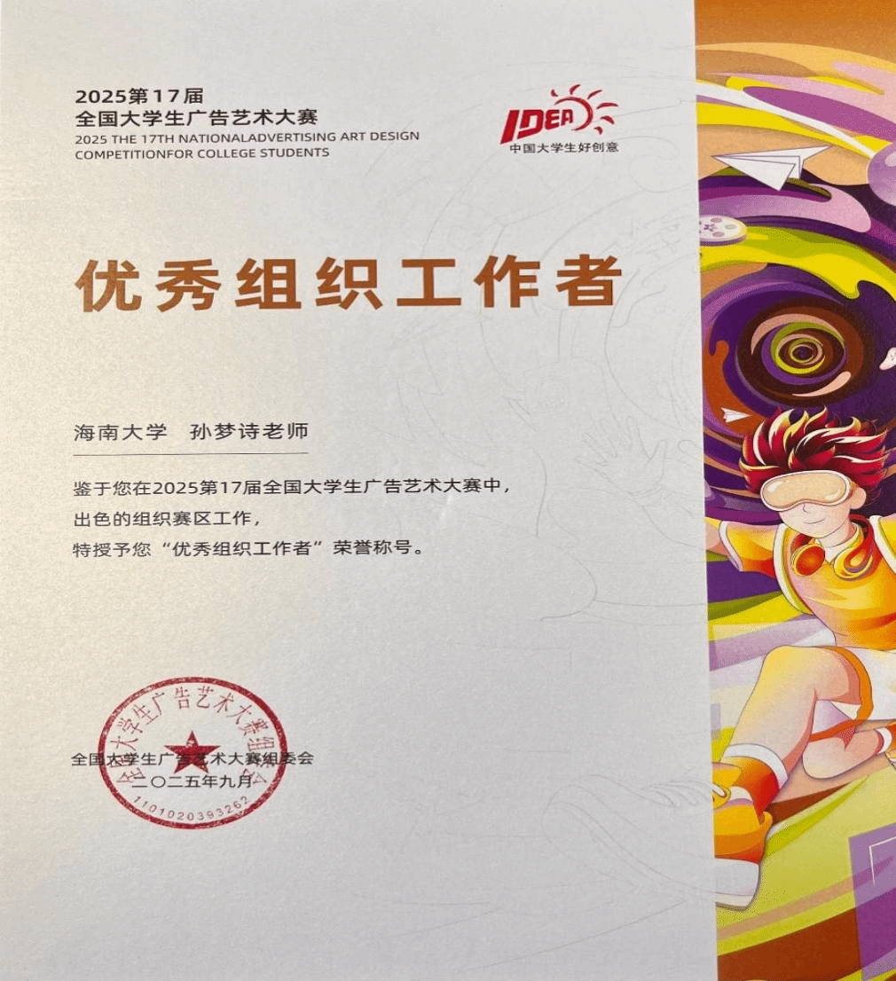 教师、大广赛海南赛区组委会秘书处孙梦诗,因卓越的组织协调能力被授予2025年度“优秀组织工作者”称号;夜月直播