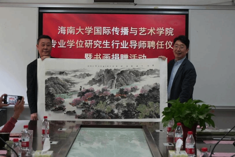 座谈会后,学院举办了行业导师聘任仪式。郑立波院长向行业导师颁发聘书,阮江华主席向学院捐赠书画作品以及画册。