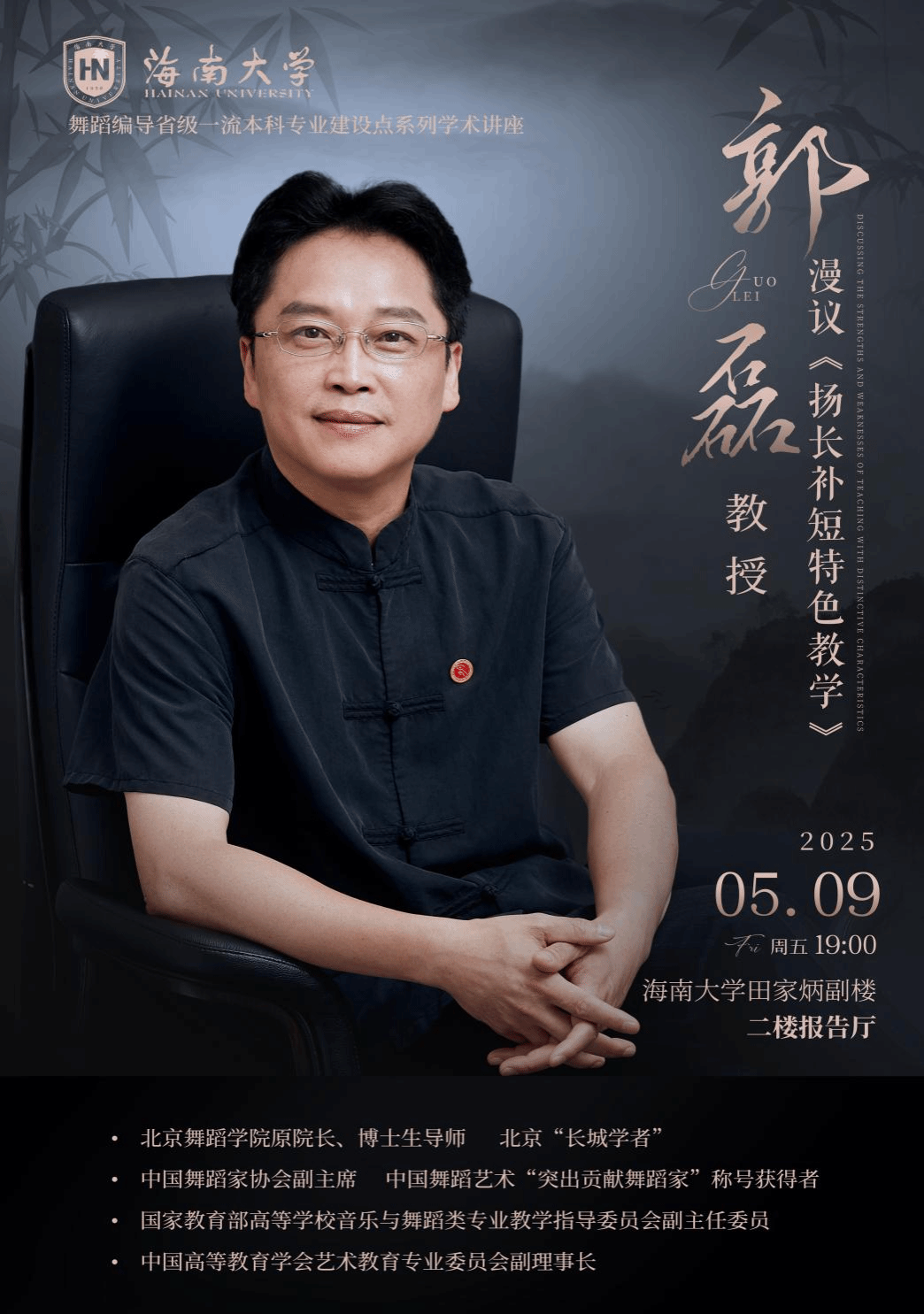 舞蹈系举办舞蹈编导省级一流本科专业建设点系列学术讲座——《扬长补短特色教学》,特邀北京舞蹈学院原院长、博士生导师郭磊教授主讲。活动由舞蹈系教师杨小强主持。