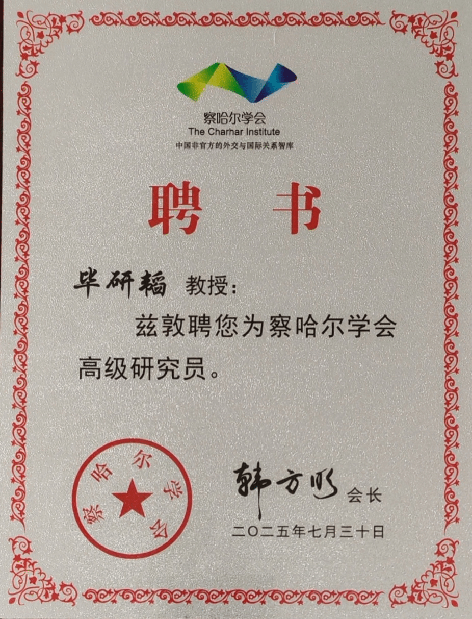 传播学系毕研韬教授受聘为察哈尔学会高级研究员。