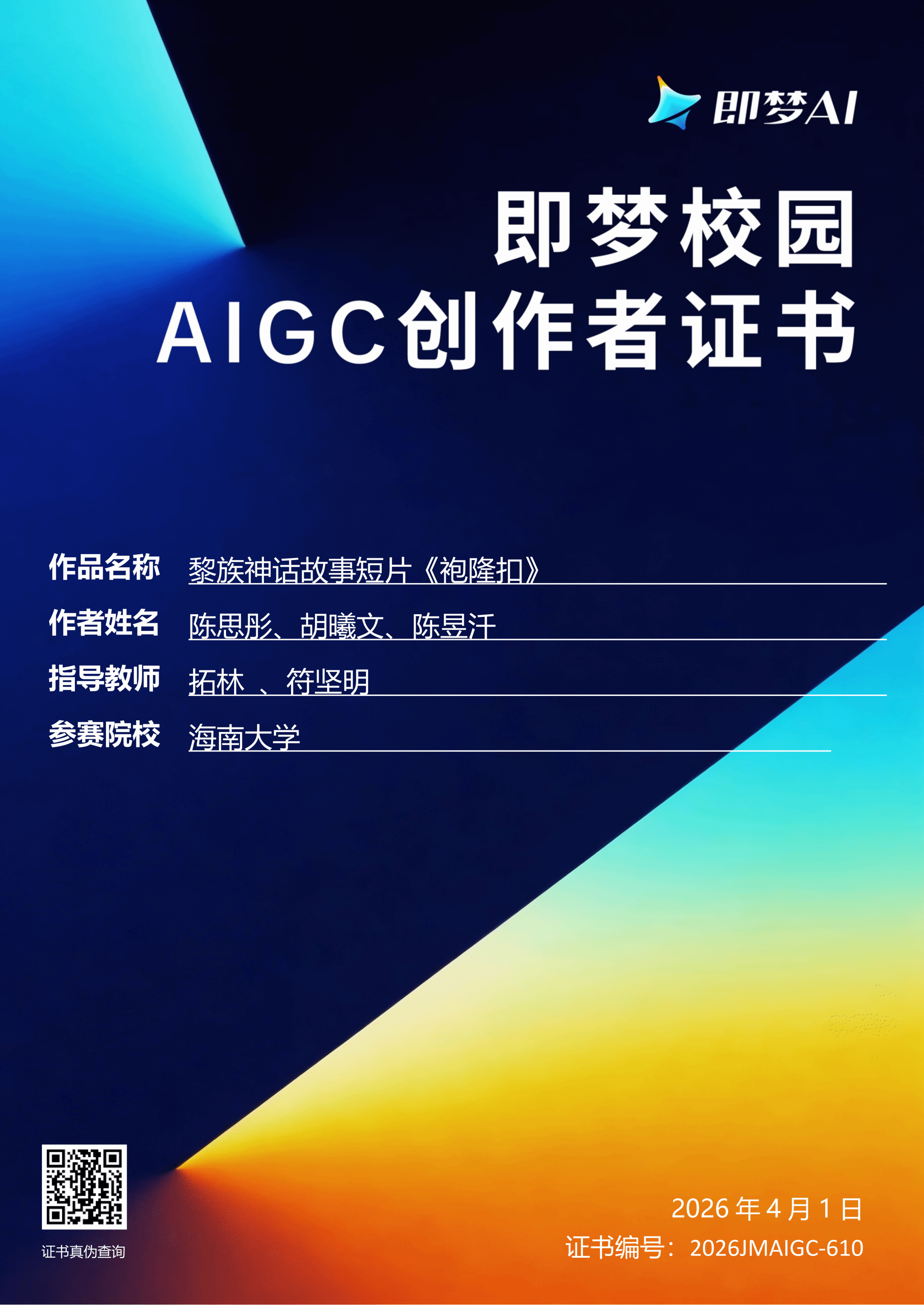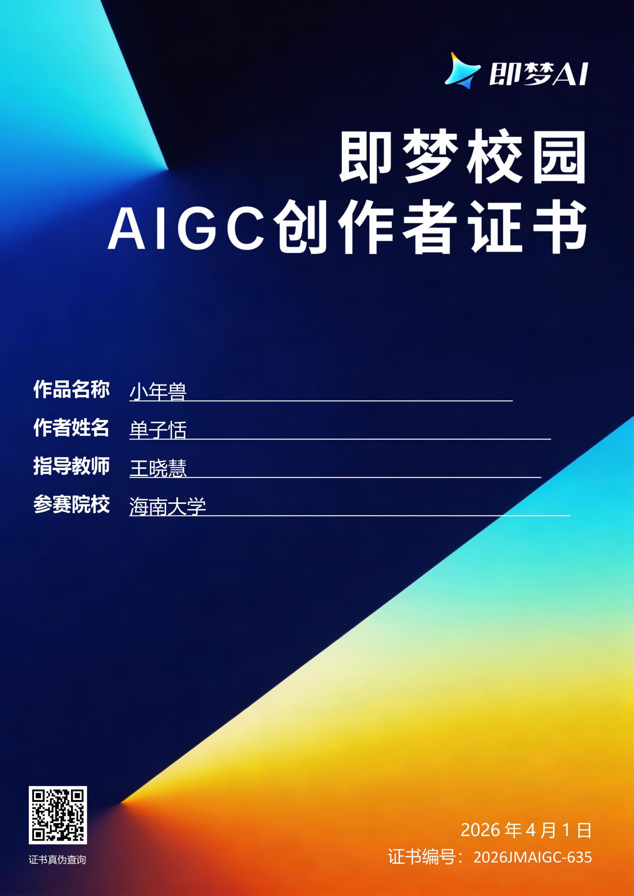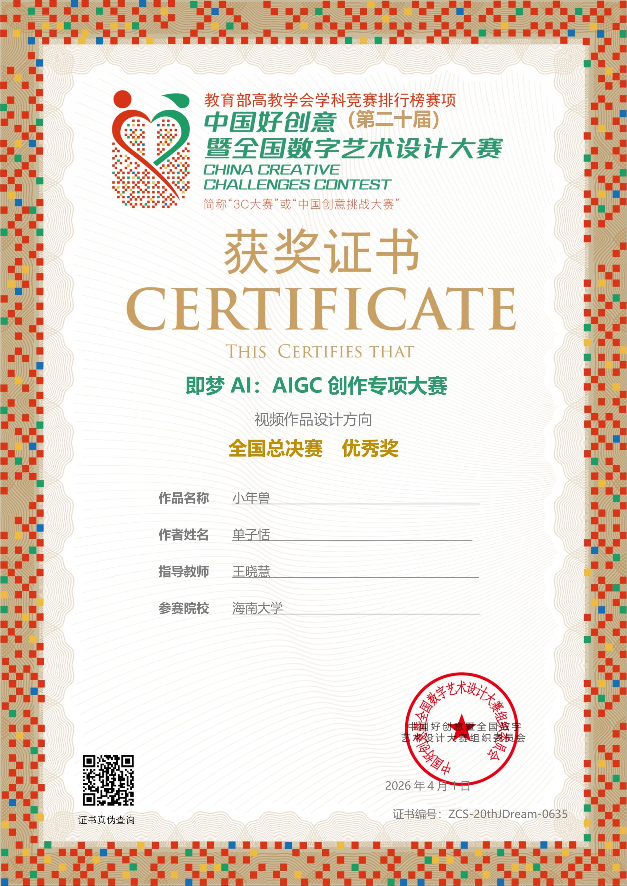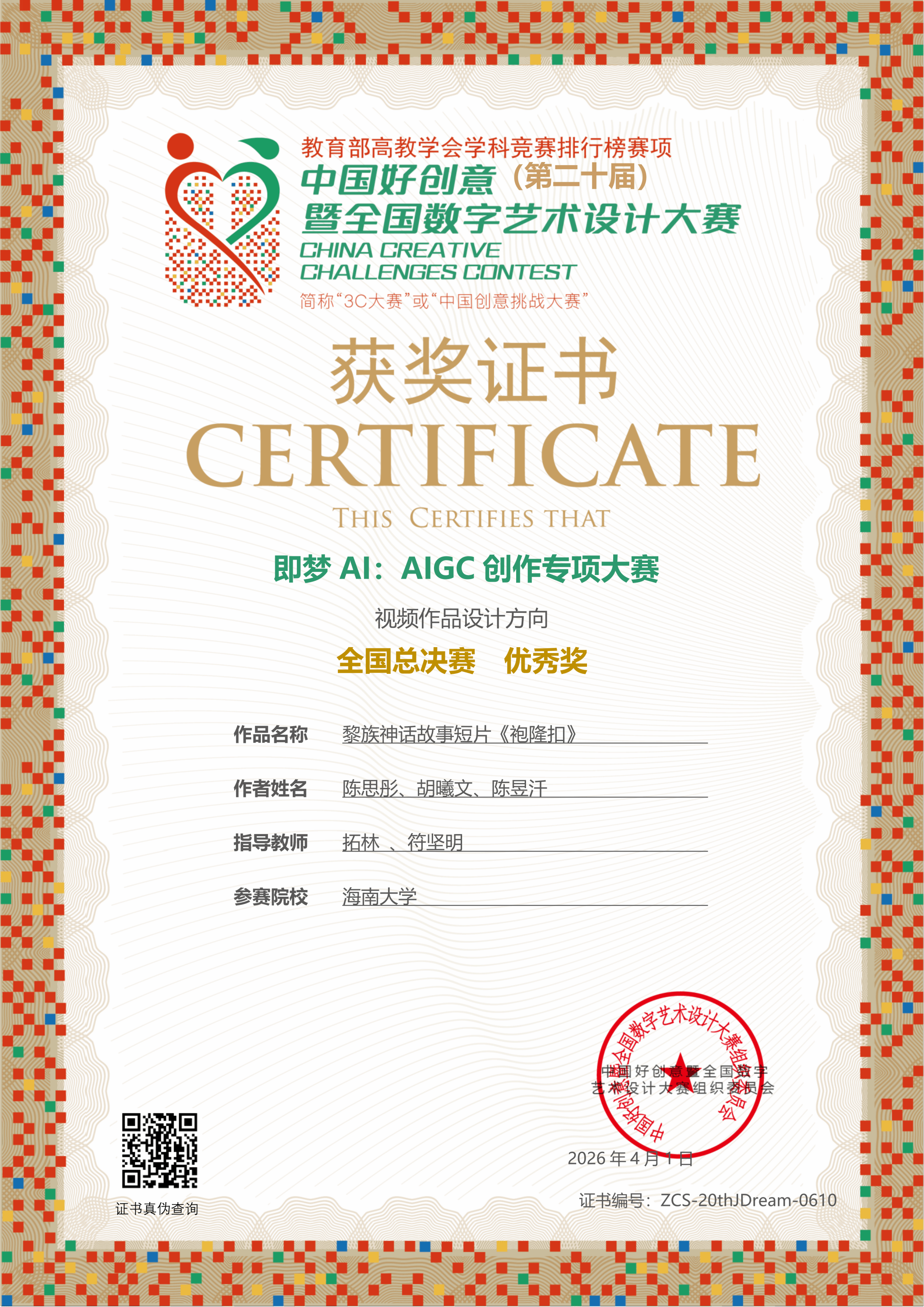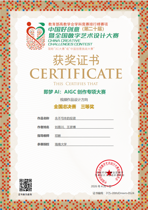 【喜报一】2026年4月1日在中国好创意暨全国数字艺术设计大赛第20届“即梦AI:AIGC创作专项大赛”中,夜月直播