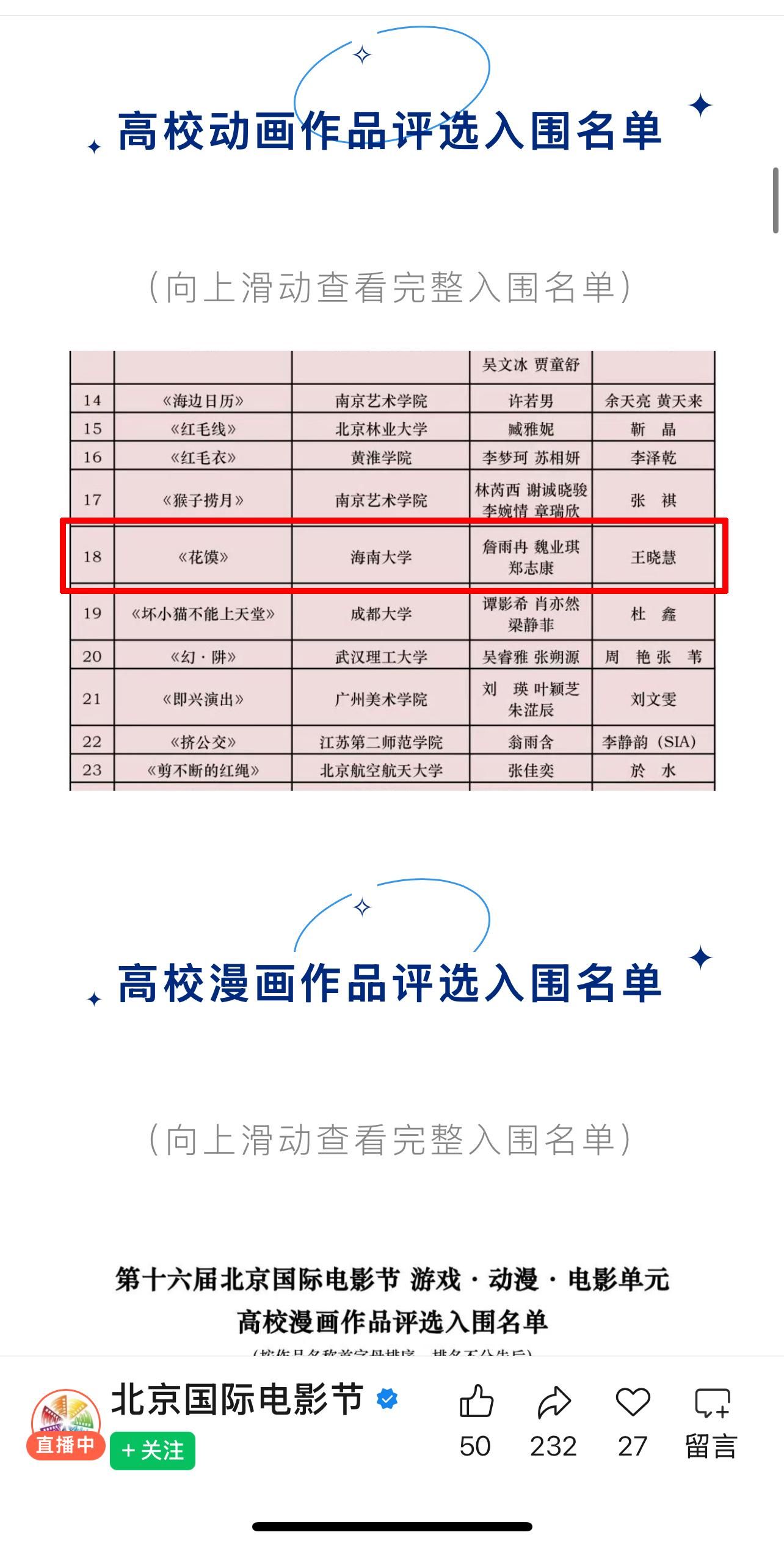【喜报二】2026年4月14日,第十六届北京国际电影节游戏·动漫·电影单元高校动漫作品评选入围名单揭晓,夜月直播