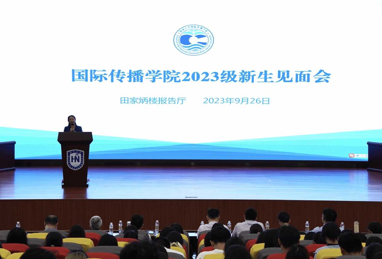 国际传播学院领导班子出席、专业责任教授、系主任、行政教辅人员、晨曦书院辅导员刘扬,农行海大支行副行长吴肇出席新生见面会,