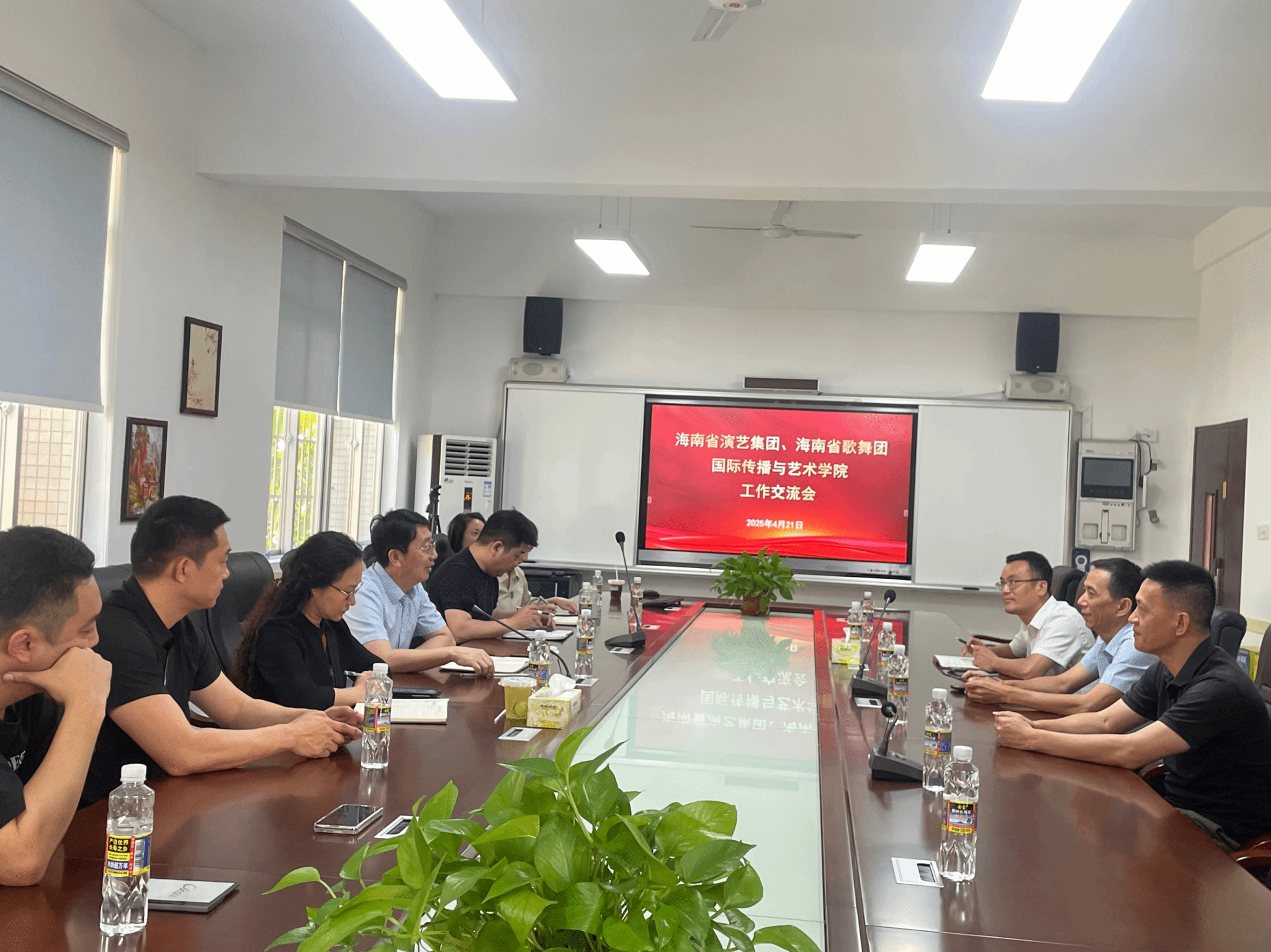 院长郑立波、副院长周琳琳及教师代表,海南省演艺集团党支部书记、副团长王涛、副团长、工会主席陈仁华、副团长周克刚参加会议。