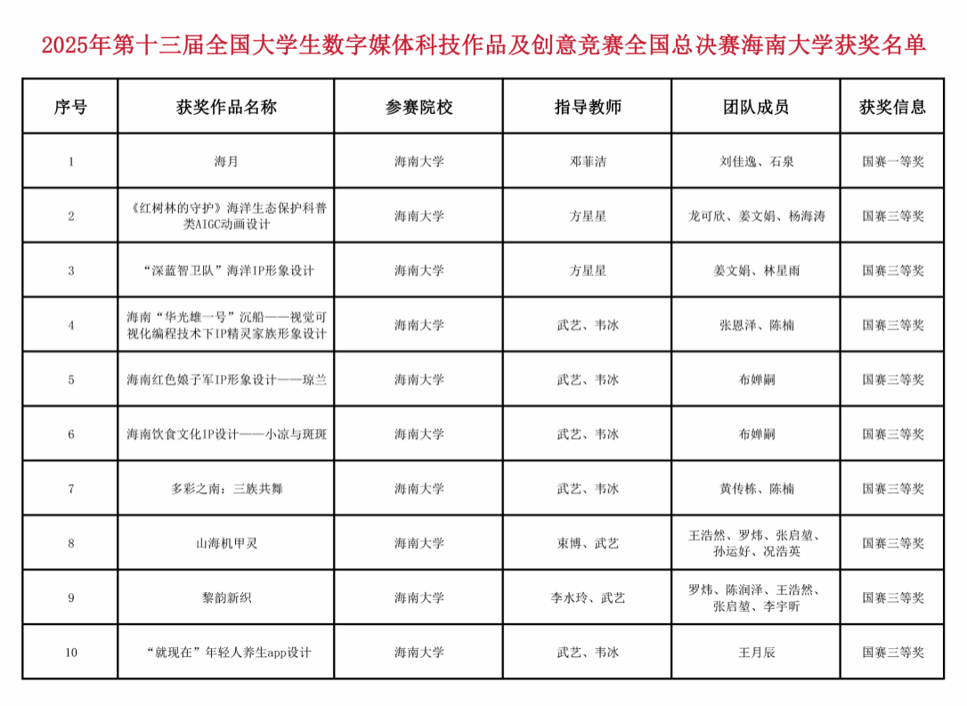 由邓菲洁老师指导的设计系25级硕士研究生刘佳逸、石泉同学团队作品《海月》,在创作阶段深入走访海南黎族聚居区,以AIGC技术展示了“拜月祭”、“浮针祈福”等黎族中秋文化,为民族故事的传播提供了新思路,荣获全国一等奖。